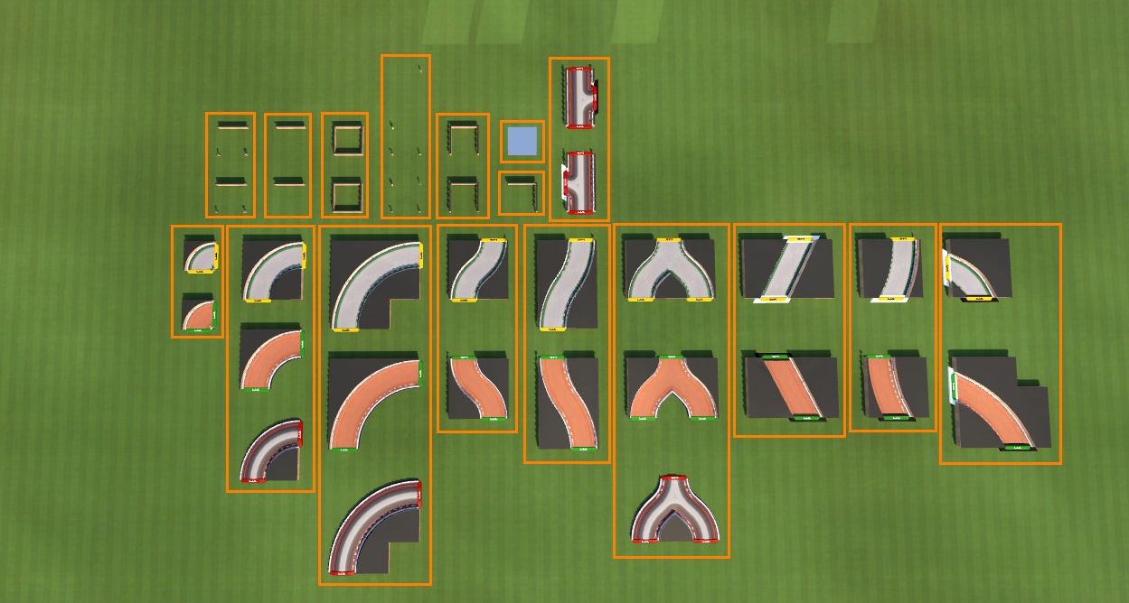 Items are matching Roadtech, RoadDirt, RoadBump and RoadIce, but you can also combine them with almost any flat platform block from TechBase, DirtBase, IceBase and GrassBase, TrackWall and DecoWall.