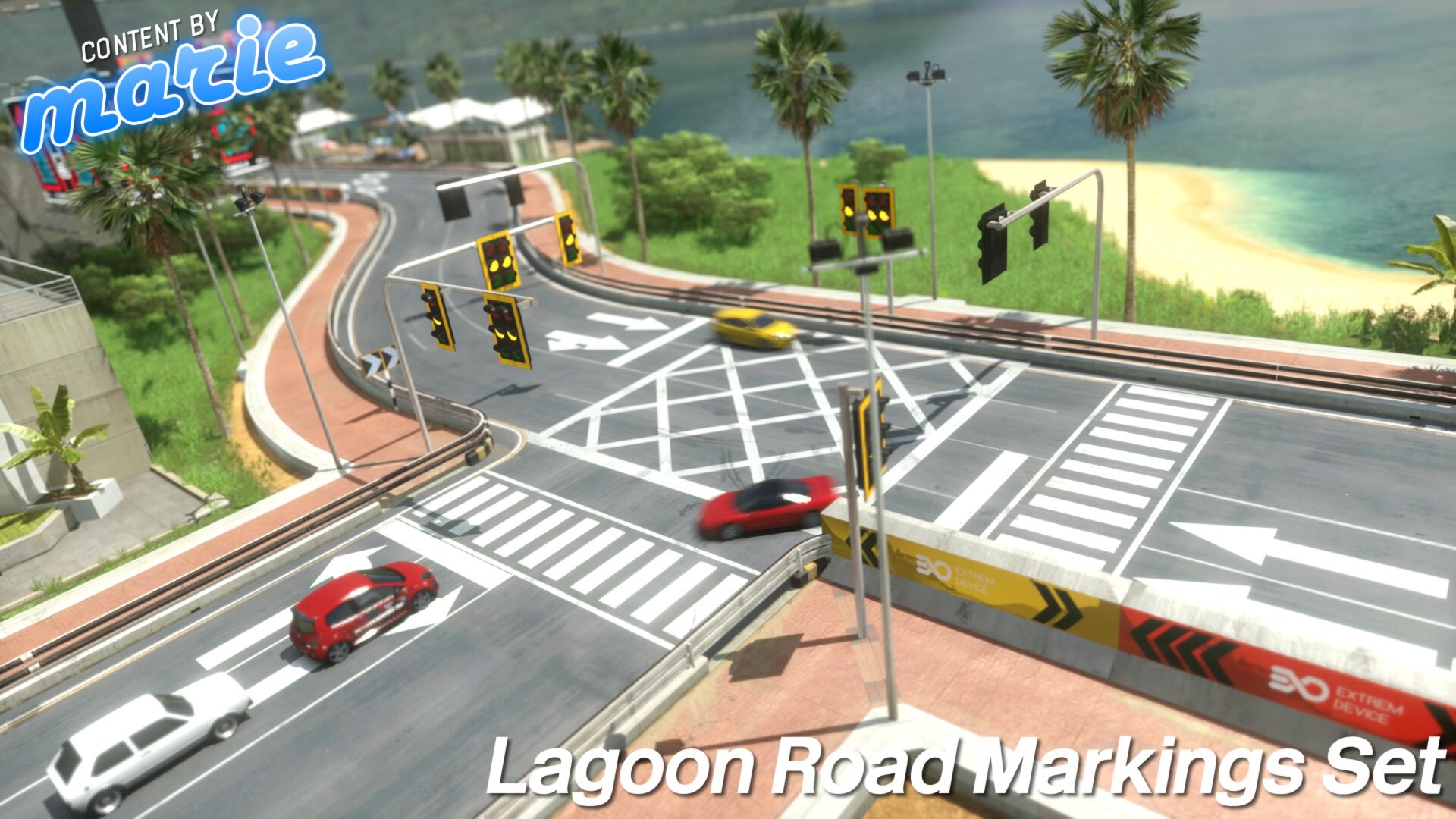 This is a collection of road markings and traffic signals for Lagoon that can be embedded. Traffic lights are animated if you use my Lagoon mod (mariejuku.github.io).
