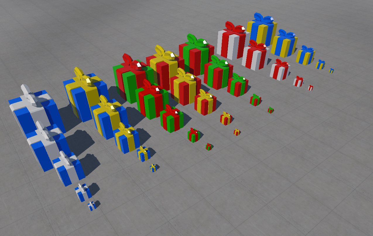 Presents in 7 different colours in 5 different sizes (8m, 6m, 4m, 2m, 1m)