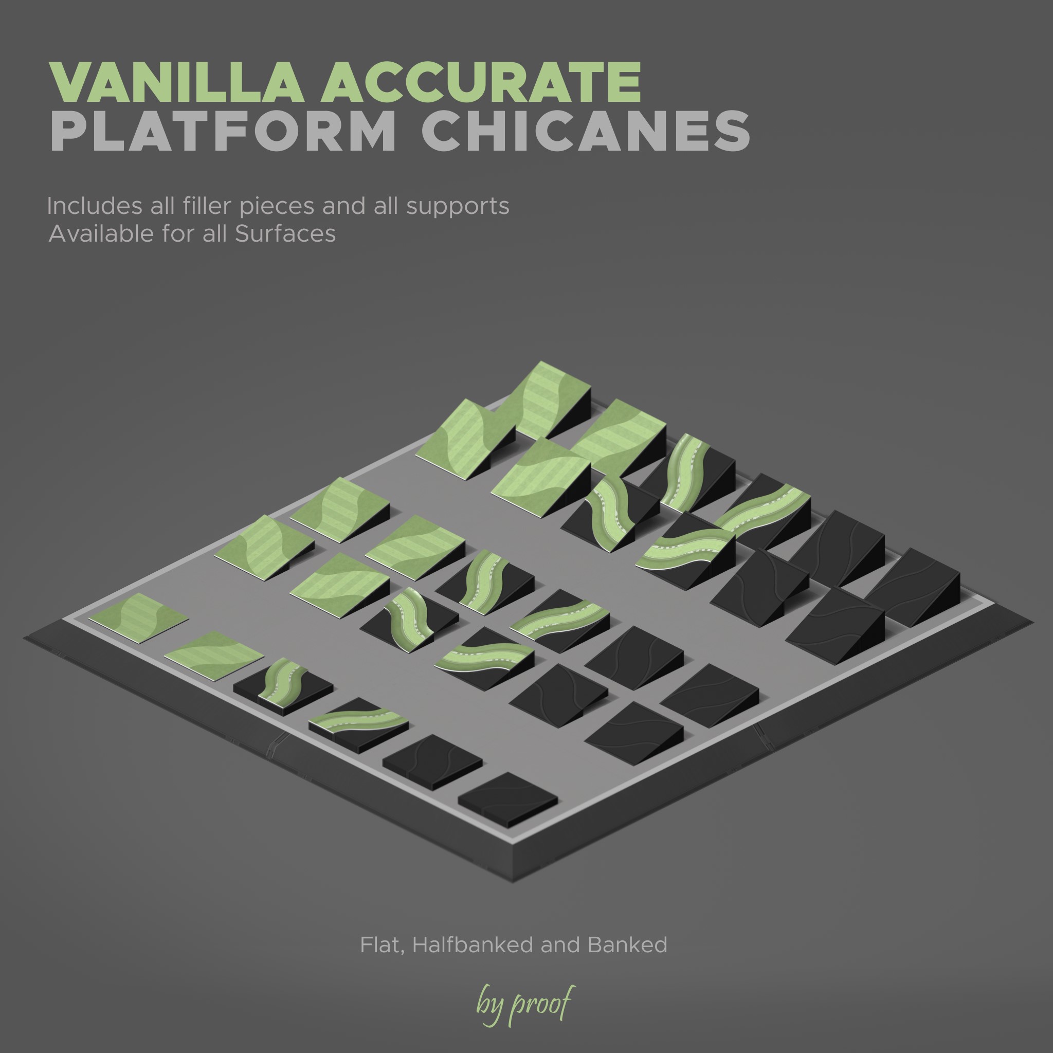 Includes the filler plattforms around the chicanes, which are compatible with road chicanes, as well as the supports below all those pieces.