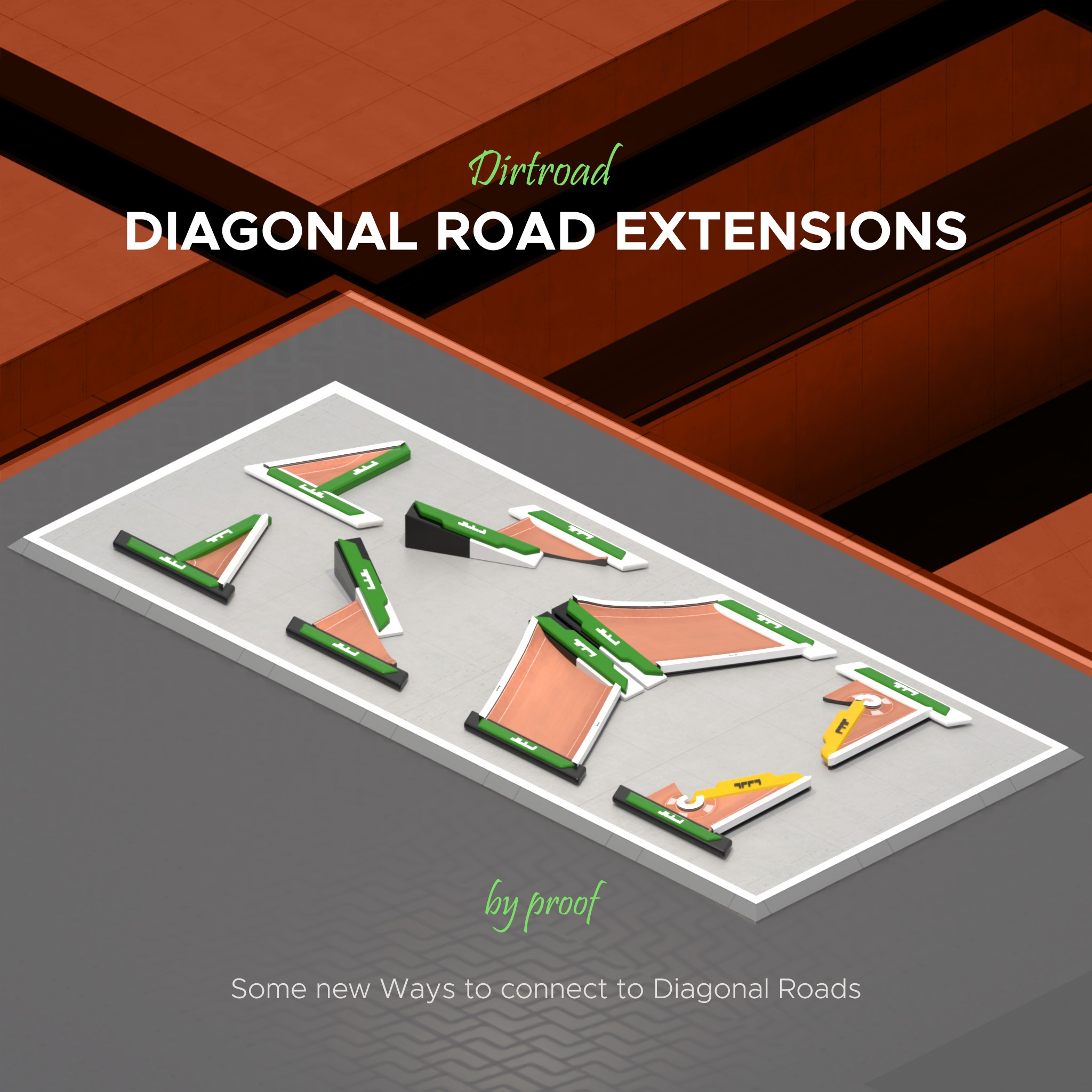 Important: Pieces 2 and 4 (on the thumbnail/ingame) slap onto the existing vanilla geometry of all diagonal pieces except T-Intersections and that weird tiny chicane. For that reason it is recommended that they are only used with the vanilla blocks and not custom items (though it might still work) see picture.